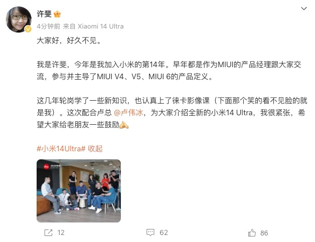小米集团总裁卢伟冰发博称,小米14Ultra发布会将搭档小米中国区副总裁许斐。作为互联网名梗,#其实挺开心的# 创造者许斐,是小米早期创业员工,2010年就加入了小米,是MIUI 6之前的小米操作系统团队的产品负责人。