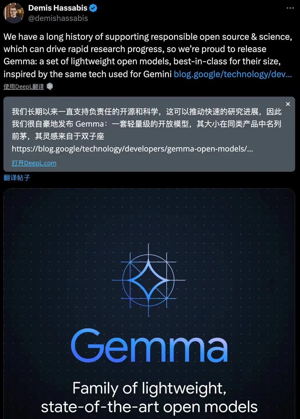 北京时间2月21日晚21点,美国科技巨头谷歌(Google)宣布推出全球性能最强大、轻量级的开源模型系列Gemma,分为2B(20亿参数)和7B(70亿)两种尺寸版本,2B版本甚至可直接在笔记本电脑上运行。 谷歌和Alphabet公司CEO 桑达尔·皮查伊(Sundar Pichai)表示,Gemma展示了强大的性能,从今天开始,该模型将在全球范围内提供,并可在笔记本电脑、工作站或谷歌云上运行。