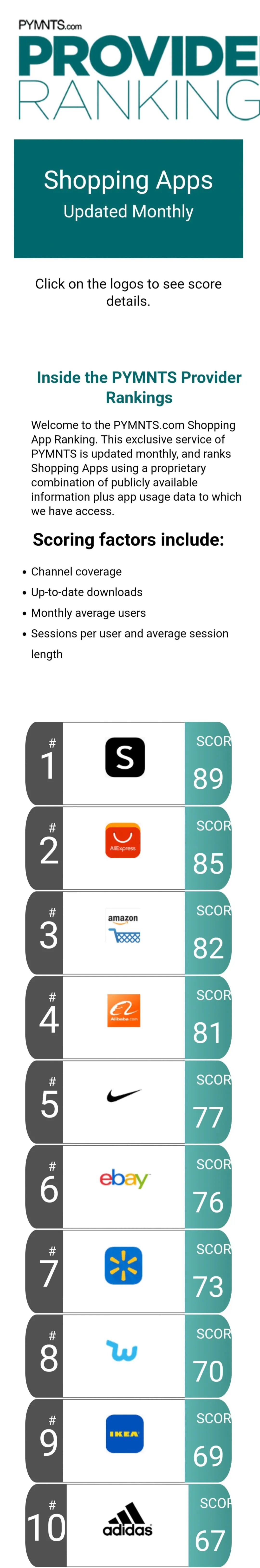 PYMNTS全球购物应用榜单是根据购物应用覆盖率、下载量、月活跃用户数和用户使用时长等综合排名,为全球消费者筛选值得信赖的热门平台。