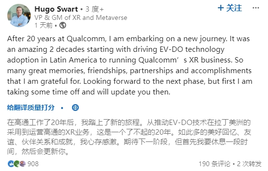 2月26日,高通XR总经理兼副总裁Hugo Swart(司宏国)在LinkedIn发文宣布离职。在贴文中Hugo Swart声称将结束高通任职的20年生涯,并踏上新的旅程。