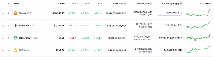 2月27日凌晨,比特币市场再次迎来大幅上涨,价格暴涨至5.7万美元/枚,最高一度触及5.75万美元/枚,创两年以来新高。当天,“比特币”这一词条冲上了微博热搜。Coinmarkecap网站显示,截至2月27日下午3点,比特币价格报5.62万美元/枚,24小时涨幅9.2%,过去一周涨幅8.31%。