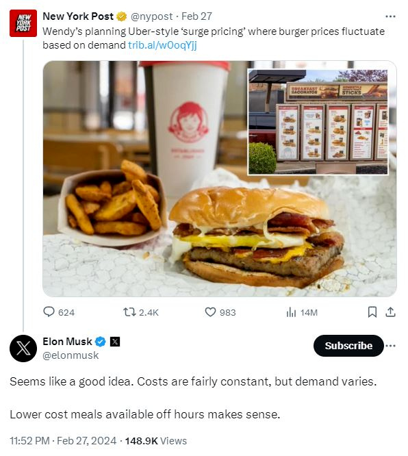 美快餐巨头拟效仿网约车动态定价,“成本大师”马斯克点赞