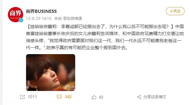 宗馥莉称效仿李嘉诚搬到国外事件被挖,曾回应:是一时口误