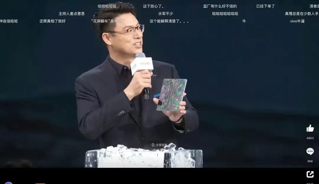 据了解,在当天的发布会上,为了证明vivo新品手机具有出色的耐用性,黄韬特意将一款手机放入冰块中进行了长时间的冰冻测试。然而,在展示过程中,观众发现手机的屏幕出现了花屏现象,引发了现场的一阵骚动。面对这一突发情况,黄韬迅速拿起手机进行仔细检查。经过短暂的分析后,他向观众解释道:“大家看到的花屏现象,其实是由于屏幕反光造成的。我在展示时选择了一个非常特殊的角度,这使得屏幕上的光线发生了折射和反射,从而产生了类似花屏的视觉效果。”