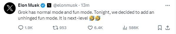 7.嫌Grok不够毒舌?马斯克:将增加“精神错乱的有趣模式”