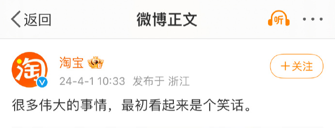 消息引发广泛期待,但也有评论认为太过超前,国内商业航天还存在不少差距,问是不是愚人节开的玩笑。淘宝对此回应称,很多伟大的事情,最初看起来都像是笑话。(凤凰网)