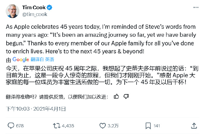 4月2日,苹果公司现任首席执行官蒂姆・库克(Tim Cook)发布推文,庆祝苹果公司成立45周年,在推文中再次提及公司联合创始人史蒂夫・乔布斯。“庆祝苹果公司成立45周年之际,乔布斯多年前曾说过的一句话至今仍历历在目,他说:‘时至今日,我们固然乘风破浪,开启了一段令人惊奇的旅程,但我们的征程才刚刚开始’。感谢苹果大家庭的每位成员为此付出的卓越贡献,让我们共同为创造下一个45周年而干杯!”(凤凰网科技)