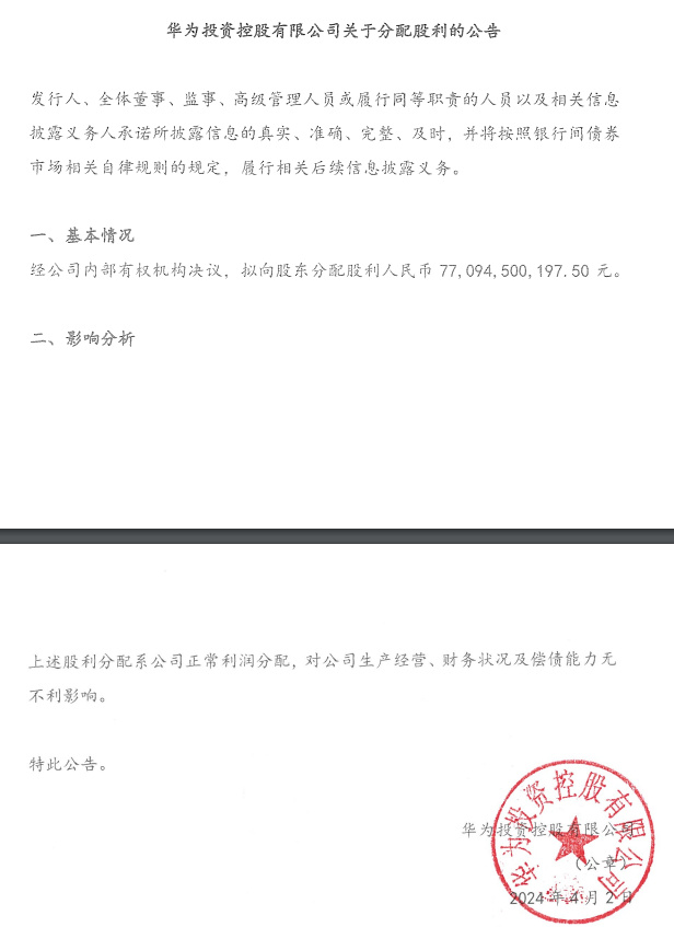 4月2日,据北京金融资产交易所官网,华为投资控股有限公司发布关于分配股利的公告。公告显示,经(华为)公司内部有权机构决议,拟向股东分配股利约770.95亿元。上述股利分配系公司正常利润分配,对公司生产经营、财务状况及偿债能力无不利影响。
