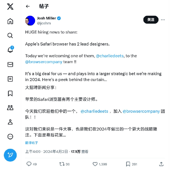 苹果公司 Safari 浏览器的主要设计师之一 —— 查理・迪茨现已离开苹果公司,加入Arc浏览器背后的The Browser Company,后者CEO乔什・米勒今日凌晨通过𝕏(推特)宣布了这一消息:苹果Safari浏览器有两个主要设计师,今天我们欢迎他们中的一员 —— 查理・迪茨,加入我们的团队!这对我们来说是一件大事,也是我们在2024年做出的一个更大的战略赌注。
