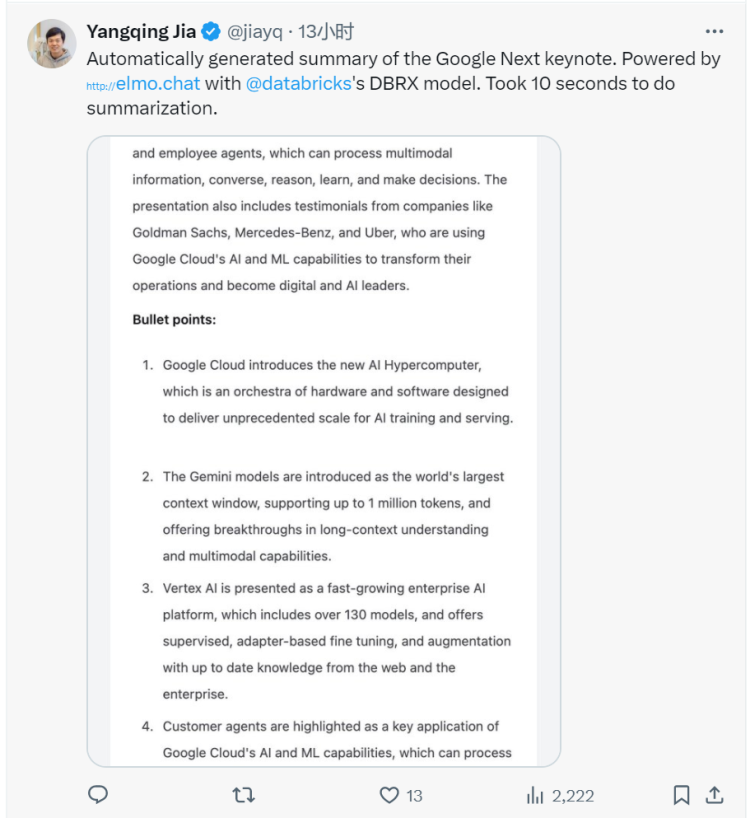 4月10日消息,原阿里首席AI科学家贾扬清在𝕏(推特)上分享了插件Elmo,该插件能在10秒内总结Google Next 主题演讲,生成一句话概括、摘要、主要观点。该插件由贾扬清去年创办的AI公司Lepton AI打造。