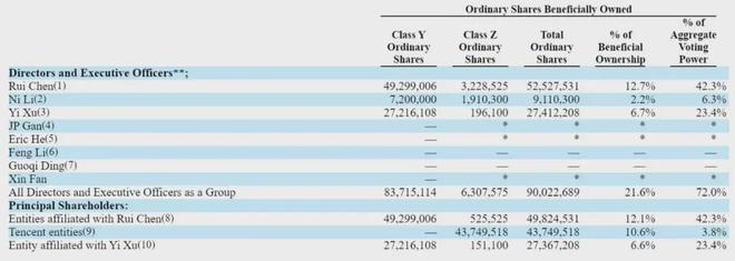 B站日前发布2023年年报。年报显示,截至2024年2月29日,B站董事局主席、CEO陈睿持有49,299,006股Y类股,及3,228,525股Z类股,一共持股为52,527,531股,有12.7%的股权,及42.3%的投票权;李旎持股2.2%,有6.3%的投票权;徐逸持股为6.7%,有23.4%的投票权;腾讯持股10.6%,有3.8%投票权。
