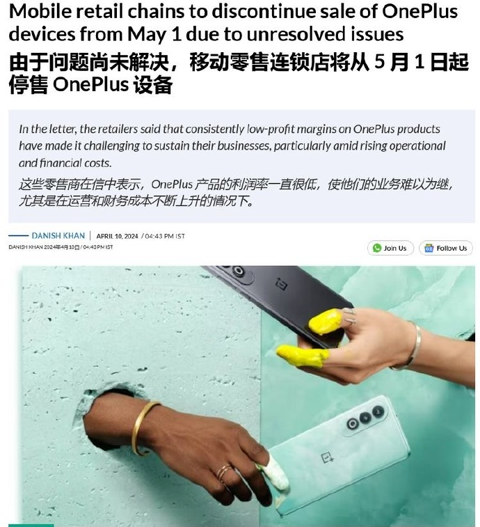 6.因利润过低,消息称印度4500家线下门店将停售一加手机