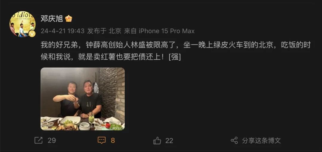 4月21日,据新浪财经CEO邓庆旭微博内容,钟薛高法人、执行董事兼总经理林盛在被限高后,坐了一晚上绿皮火车来到北京,他表示,就是卖红薯也要把债还上。