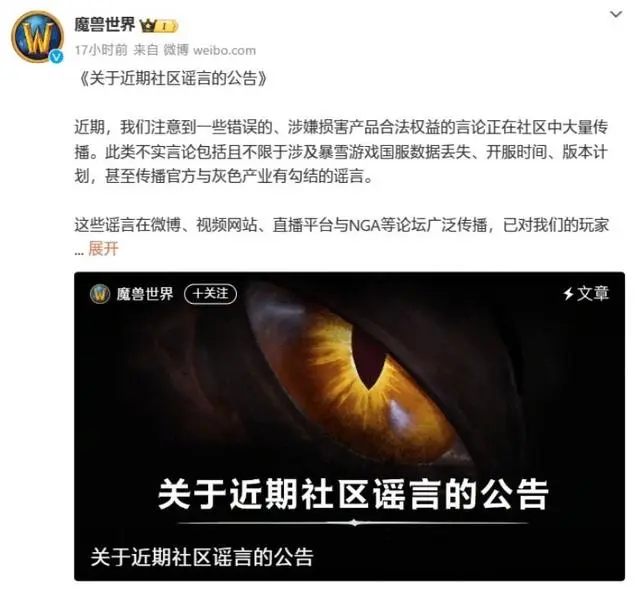 据网易暴雪游戏运营团队消息,近期,我们注意到一些错误的、涉嫌损害产品合法权益的言论正在社区中大量传播。此类不实言论包括且不限于涉及暴雪游戏国服数据丢失、开服时间、版本计划,甚至传播官方与灰色产业有勾结的谣言。