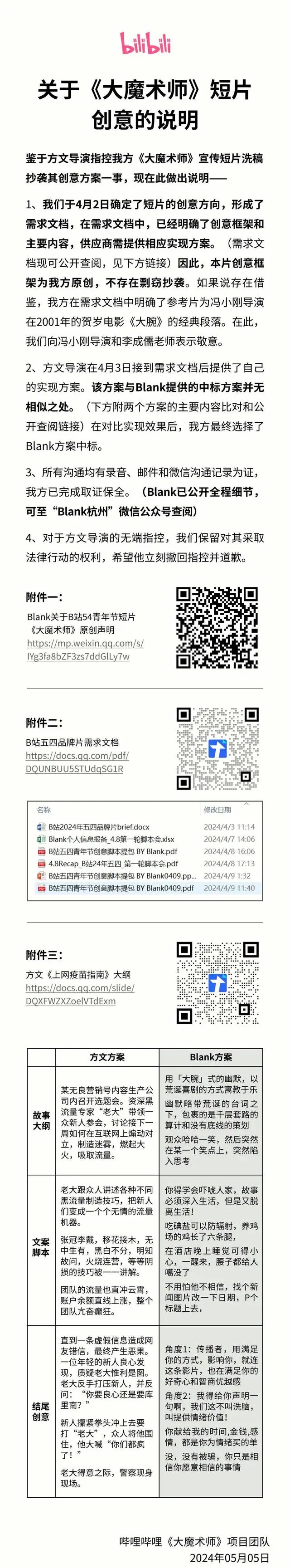 5月5日,哔哩哔哩《大魔术师》项目团队回应方文导演指控《大魔术师》洗稿抄袭其创意方案。项目团队称,本片创意框架为其原创,不存在剽窃抄袭。方文导演的方案和Blank提供的中标方案并无相似之处,希望方文立刻撤回指控并道歉。