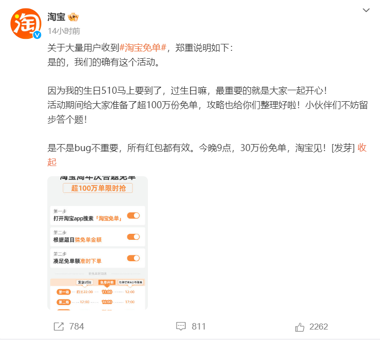 对此,淘宝官方晚间进行了回应:“因为我(淘宝)的生日510马上要到了,活动期间给大家准备了超100万份免单。”符合参与条件的用户在活动期间登录淘宝App首页或者登录网页版淘宝,在指定时间内下单、订单金额为正确金额且排名前n的用户可获得该金额对应的免单红包。
