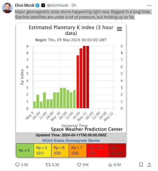 马斯克:星链卫星因地磁风暴承受巨大压力,目前还能挺住