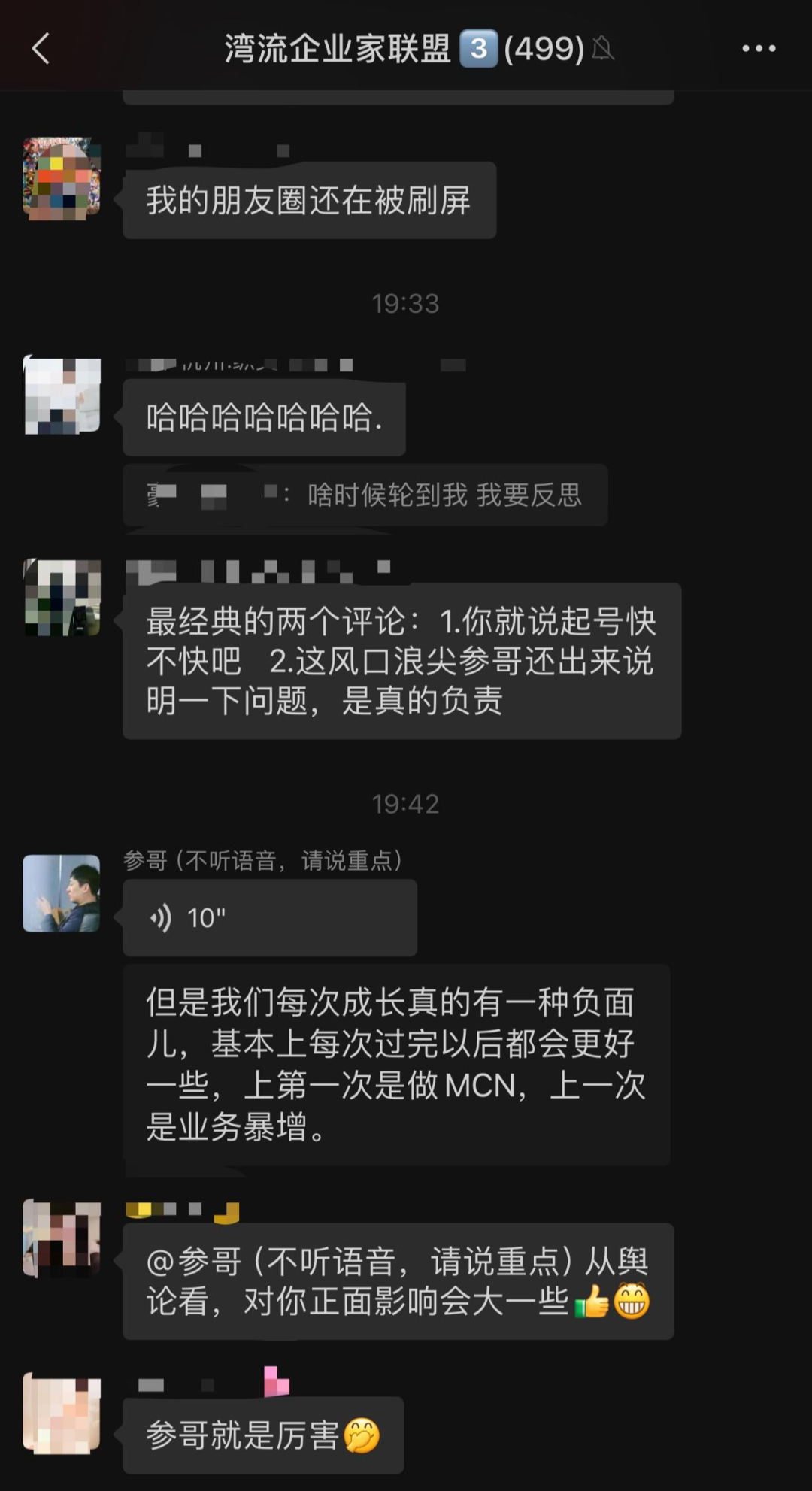 最近几天,因为璩静事件,网红“参哥”再次备受关注。5月11日,参哥在微信群表示,每次成长有一种负面,基本上每次过后都会更好一些,上一次业务暴增。其他群友纷纷点赞,表示羡慕嫉妒恨。面对群友询问的现在状态如何,参哥表示这都第三次了,习惯了都。