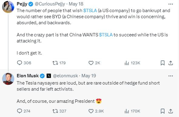 近日,一位特斯拉投资者发帖称:“很多人希望特斯拉(一家美国公司)破产,而宁愿看到比亚迪(一家中国公司)蓬勃发展并获胜,这是令人担忧的、荒谬的和倒退的。疯狂的是,中国希望特斯拉成功,而美国却在攻击它。我不明白。”马斯克回应称:“特斯拉的反对者声音很大,但除了对冲基金卖空者和极左激进分子之外,很少有人反对。”(环球市场播报)