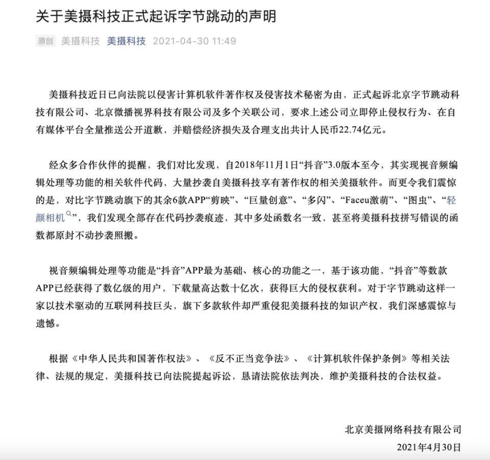抖音等字节系多款App被指控抄袭源代码,美摄科技被曝“天价索赔”,最新回应