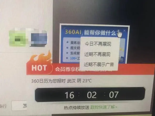 近日,市民刘先生反映称电脑里的360安全卫士软件弹窗不断,“弹窗设置”中的选项多达50余项。刘先生录制的视频显示,“360日历”板块的广告框有3个选项:“今日不再展现”“近期不再展现”“近期不展示广告”。选“近期不展示广告”后,又弹出了新的广告页面。“只针对这一条吗?近期是多久?这3个选项有什么区别?”他疑问连连。他还注意到,弹窗广告里的关闭选项让人眼花缭乱,无论如何选择,过一段时间,还是照“弹”不误。据他统计,自己上班使用电脑期间,25至30分钟就会收到一次弹窗广告,有时甚至隔几分钟就出现一次弹窗。