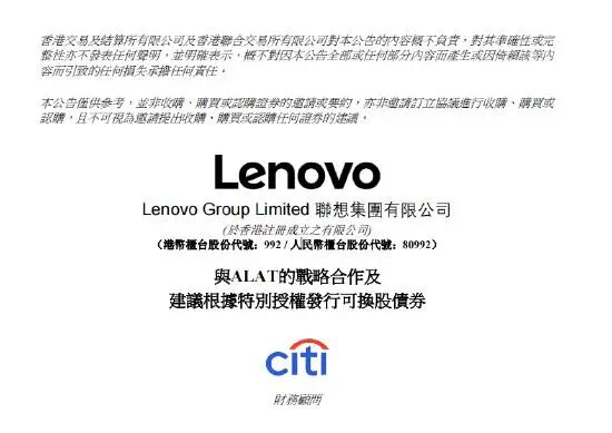 除战略合作框架协议外,联想与Alat亦签订了债券认购协议,据此公司将向Alat发行20亿美元的零息可转换债券,所得款项净额将用于偿还本公司现有债务以及补充营运资金及一般企业用途。可转换债券为免息并将在发行后三年到期(可根据条款及条件延期三个月),到期时可根据条款及条件转换为股份。