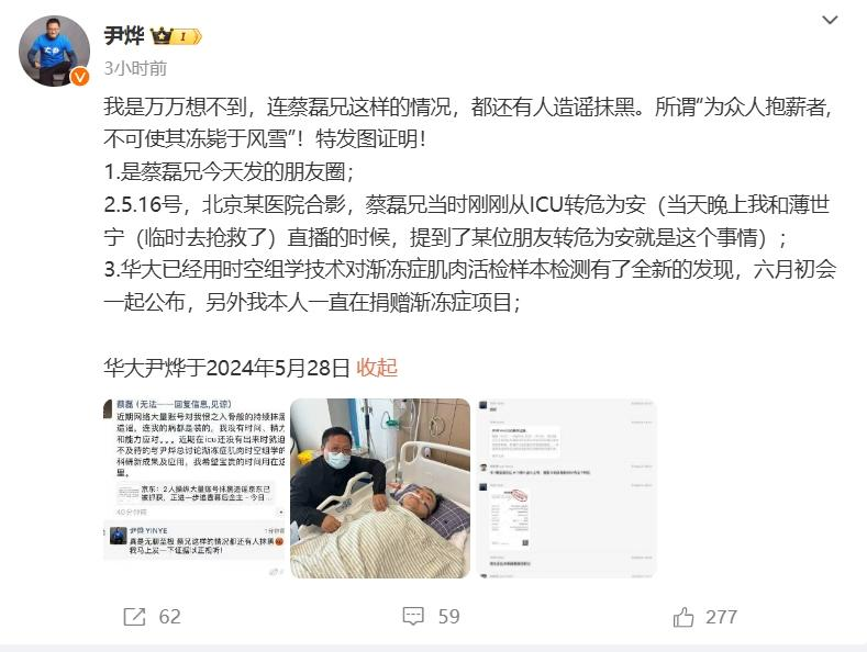 此外,尹烨微博转发了蔡磊的朋友圈截图,并表示:“我是万万想不到,连蔡磊兄这样的情况,都还有人造谣抹黑。”尹烨还表示:“5月16日,在北京某医院合影,蔡磊兄当时刚刚从ICU转危为安。当天晚上我和薄世宁(临时去抢救了),直播的时候提到了某位朋友转危为安,就是这个事情。”(三言科技)