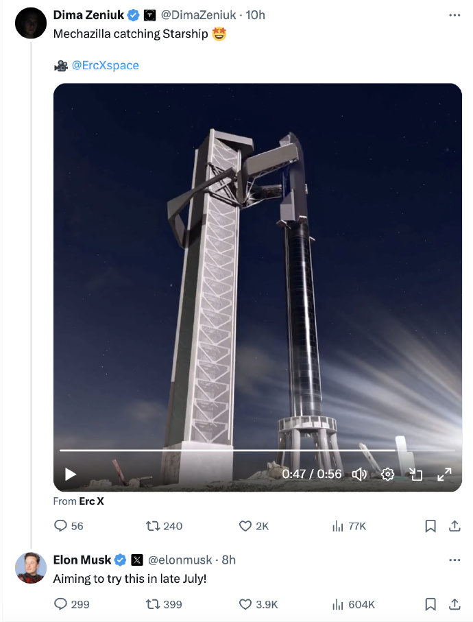 近日,马斯克在X上表示,SpaceX计划在7月底测试用Mechazilla捕捉并回收“星舰”飞船和助推器。Mechazilla是一个带有机械手臂的发射塔,可以在着陆后抓住并移动“星舰”飞船火箭及其助推器。