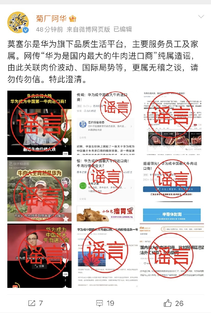 网传“华为是国内最大的牛肉进口商”,华为:纯属造谣