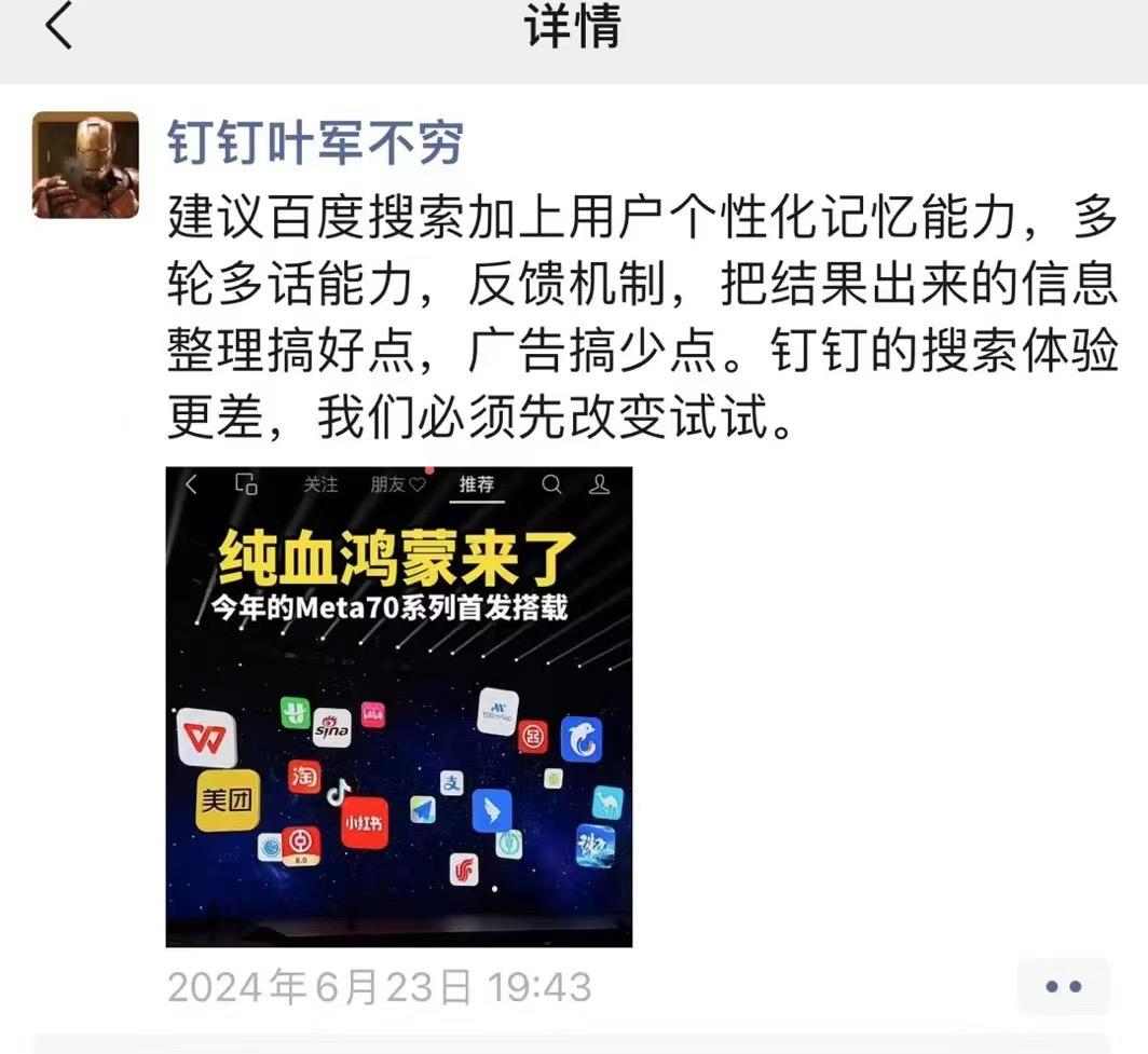 继吐槽百度搜索“10条结果都是广告”后,钉钉总裁叶军再次在朋友圈发文称,“钉钉搜索体验更差,必须先改变”。叶军表示,建议百度搜索加上用户个性化记忆能力,多轮多话能力,反馈机制,把结果出来的信息整理搞好点,广告搞少点。最后,他指出钉钉的搜索体验更差,必须先改变试试。