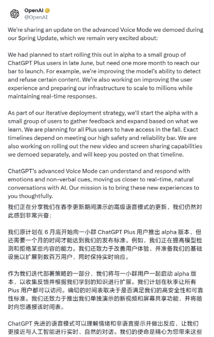 6月26日凌晨,OpenAI在 𝕏(推特)上发文宣布,备受期待的ChatGPT语音助手功能将被推迟发布,因为公司需要确保它能够“安全有效地”处理来自数百万用户的请求。OpenAI表示,该公司原本打算在6月底向一小部分付费ChatGPT plus用户推出语音功能,但后来认为还需要一个月的时间才能“达到我们的标准”。