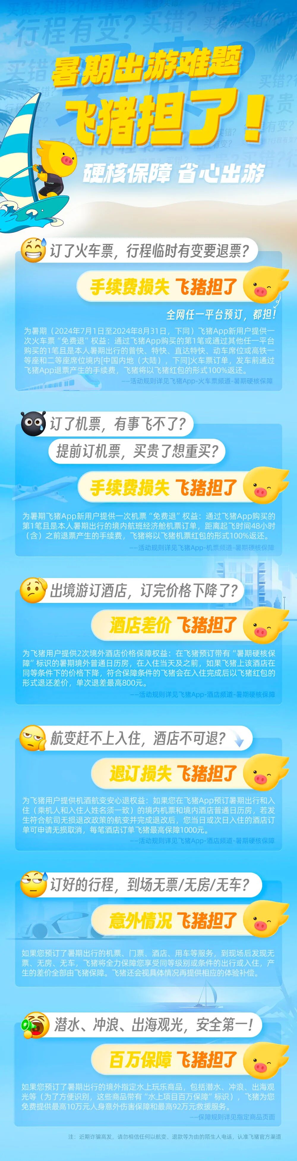 其中,主动帮助用户挽回损失的举措包括:为飞猪App新用户提供机票和火车票的“免费退”权益。帮助用户避免潜在损失的举措包括:如因航班航变而影响酒店入住,飞猪将为符合条件的消费者提供酒店无损取消,单笔补贴最高达1000元;消费者出发或到达现场如遇航班无座、酒店无房等极端情况,平台将无论差价全力保障消费者行程;出境游玩时的潜水、冲浪、出海观光一向是热门项目,飞猪将为预订特定水上玩乐商品的所有消费者提供最高百万元的意外保障。飞猪此次推出的六大保障举措覆盖7月1日至8月31日整个暑期。