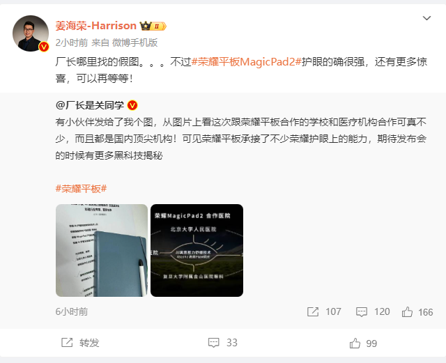 7月2日,有网友发布微博称,有图片显示荣耀平板与不少学校和医疗机构合作。随后,荣耀终端有限公司中国区CMO@姜海荣-Harrison 转发该微博否认网友发布的图片真实性。