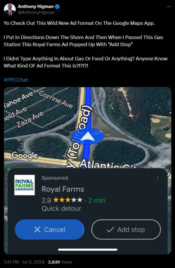 7月9日消息,据媒体报道,谷歌地图正在进行一项新的广告测试,该测试涉及在用户导航过程中弹出大幅广告。根据用户安在社交媒体上的分享,在通勤途中使用谷歌地图导航时,突然弹出了一个覆盖屏幕下半部分的广告,推荐他经过一家Royal Farms加油站,尽管他并未搜索过此类地点。
