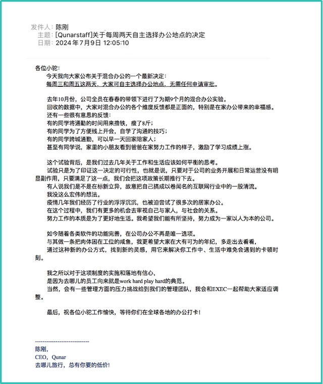 7月9日,去哪儿CEO陈刚发布全员信《关于每周两天自主选择办公地点的决定》表示,从7月15日起,每周三、周五,员工可以灵活选择办公地点。陈刚在全员信中称,员工按规定混合办公,“无需任何申请审批”。