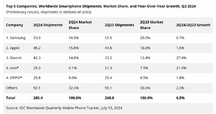 国际数据公司报告显示:2024年第二季度全球手机市场时隔两年迎来回暖,出货量大涨6.5%达2.85亿台。排行榜TOP5分别是三星、苹果、小米、vivo和OPPO。