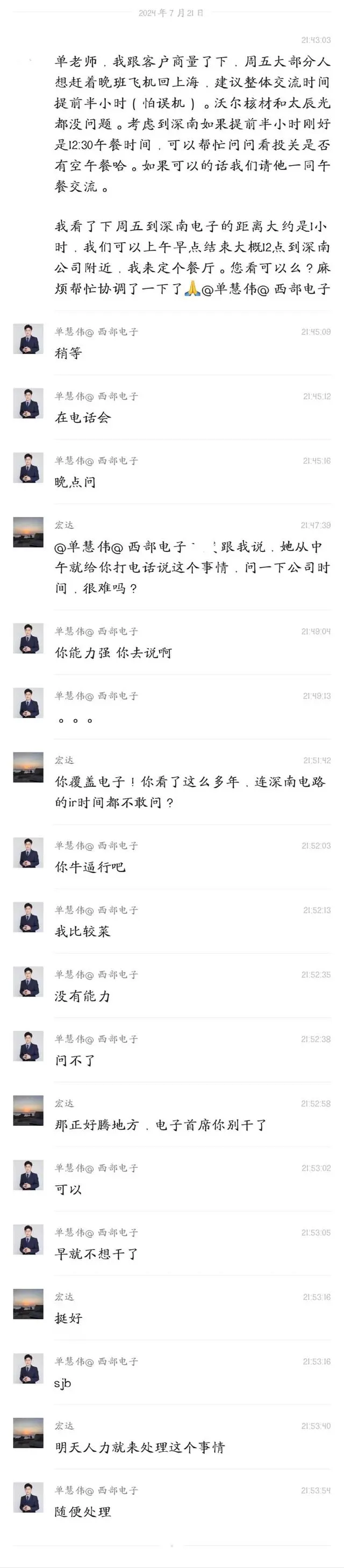 7月22日下午,一则来自西部证券研究所工作群的聊天记录不胫而走,牵涉主要当事人有二,分别是西部证券业务副所长、科技行业首席分析师郑宏达以及西部证券电子首席分析师单慧伟。根据聊天记录,7月21日晚上十点前后,西部证券研究所销售人员请求西部证券电子首席分析师单慧伟联系上市公司,单慧伟则表示在电话会上,稍后联系。两人随后发生了口角之争,针锋相对。