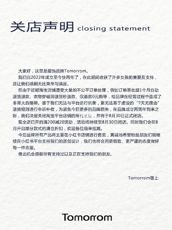 7月22日消息,服饰品牌Tomorrom 近日发布公告称,由于近期淘宝店铺遭受大量不公平订单处理,决定关闭淘宝平台店铺的所有运营,并将于8月30日正式闭店。今后品牌所有产品将主要在小红书店铺进行售卖。公告提到,有订单签收超1个月自动退货退款、衣物穿破洞退货秒退款、仅退款0元购等,给品牌在经营过程中造成了非常大的阻碍。