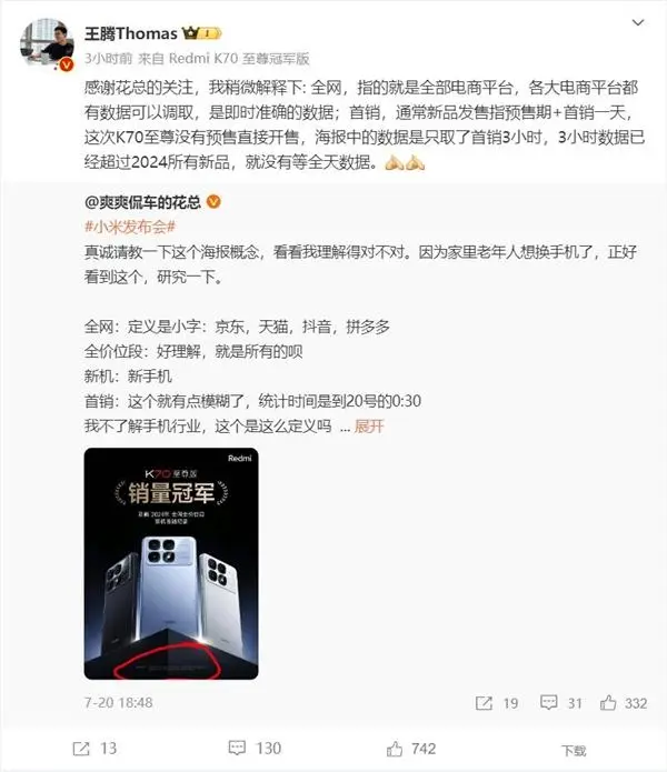7月22日消息,小米中国区市场部副总经理、Redmi品牌总经理王腾在微博回应了一博主@爽爽侃车的花总对K70至尊版的销量数据疑问。该博主称“首销”这个概念就有点模糊。他表示,“统计时间是到20号的0:30,22点发布会结束,相当于首销的意思就是发布后2个半小时,还是说22:00-0:30这个时间段”。