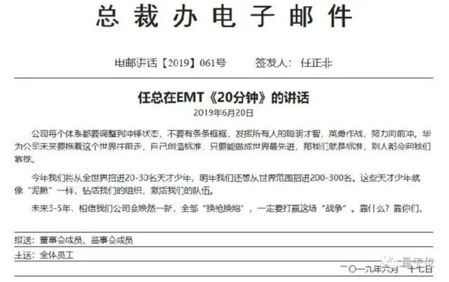 据悉,华为“天才少年”项目,是2019年任正非发起的用顶级挑战和顶级薪酬去吸引顶尖人才的项目。2019年6月,华为内部的心声社区挂出任正非6月20日在公司EMT(经营管理团队)《20分钟》的讲话。