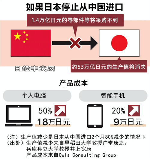 近日,《日经中文网》发表了“如果日本脱离中国有多大代价?”的文章。分析指出,供应链脱离中国将大幅增加所有产品的成本。如果零部件等中国对日本的进口的80%中断两个月(约1.4万亿日元),日本不仅无法生产家用电器、汽车和树脂,而且也无法生产服装和食品。价值约53万亿日元(目前汇率约合人民币2.5623万亿元)的生产值将消失,相当于日本每年10%的GDP被吹走。