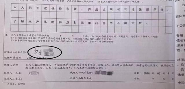 上图:刘女士声称该合同并非由本人签字;下图:另一份保险合同上刘女士的本人签字