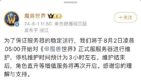 8月1日午间,魔兽世界官微宣布,为了保证服务器的稳定运行,其将于8月2日凌晨05:00开始对《魔兽世界》正式服服务器进行维护,停机维护时间预计为3小时左右。维护结束后,角色直升等增值服务将再次开启。