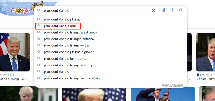 特朗普指的是马斯克等人有关谷歌正在干扰查找这位前总统相关信息的说法。马斯克称谷歌对特朗普实施了“搜索禁令”,并分享了一张图片。这张图片看起来显示的是,当搜索“总统唐纳德(president donald)”时,引擎的自动更正建议选项之一为“唐老鸭(donald duck)”。(财联社)