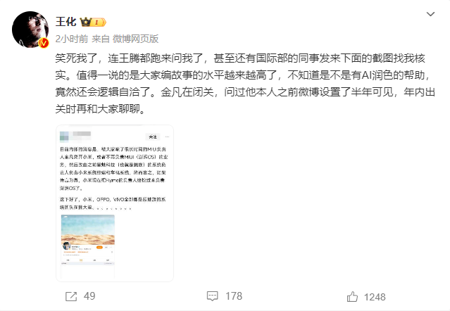 对此,小米公关部总经理王化回应称,“连王腾都跑来问我了,甚至还有国际部的同事发来下面的截图找我核实。值得一提的是大家编故事的水平越来越高了,不知道是不是有AI润色的帮助,竟然还会逻辑自洽了。金凡并未离职,在闭关,问过他本人,之前微博设置了半年可见,年内出关时再和大家聊聊。”(更多相关内容请点击金凡离职?小米王化辟谣| 骁龙8 Gen 4首个靠谱跑分出炉:多核8840分 | 疑似vivo X200通过无线电核准)