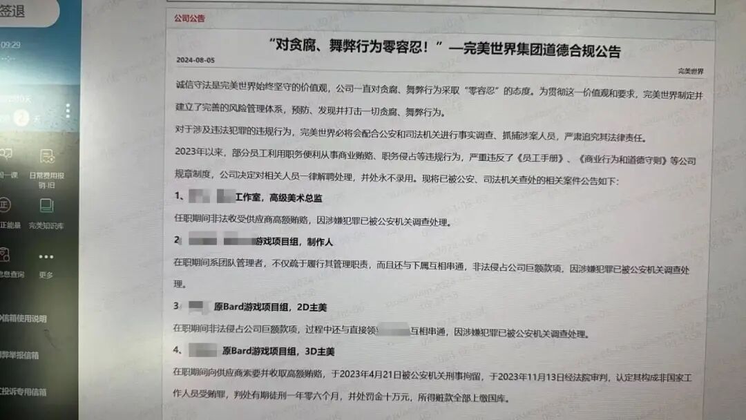 3.完美世界发布道德合规公告,对贪腐舞弊行为零容忍,4人立案调查、1人刑拘