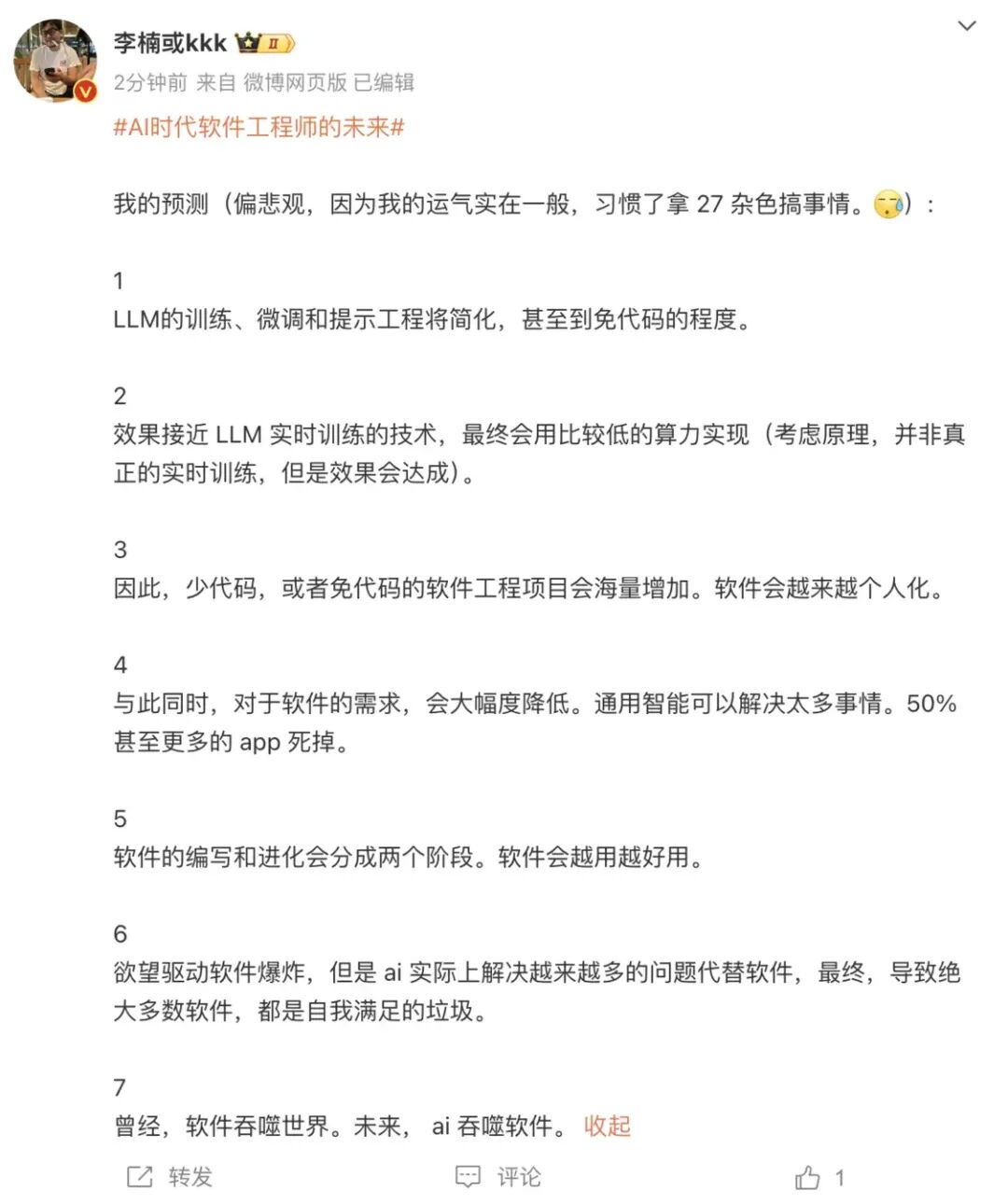 8月6日,李楠在其微博发表关于AI时代对软件工程师的影响的评论,李楠表示大模型训练、微调和提示工程将简化,甚至到免代码的程度。未来少代码,或者免代码的软件工程项目会海量增加,50%甚至更多的App会死掉。李楠还表示,AI大模型能解决的问题越来越多,最终会替代软件,绝大多数软件都是自我满足的垃圾。曾经,软件吞噬世界。未来,AI吞噬软件。(凤凰网科技)