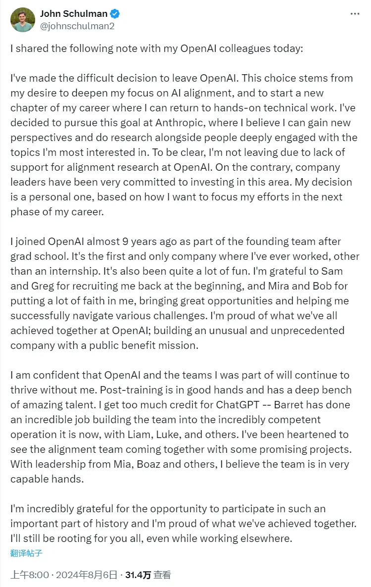 OpenAI CEO萨姆·阿尔特曼在Schulman离职博文下进行了评论回应,“感谢您为OpenAl所做的一切!您是一位杰出的研究者,对产品和社会有着深刻的思考,最重要的是,您是我们所有人的好朋友。”不过对于Altman的“深情告白”,网友并不买账,因为此前Altman亲自写的推文中“OpenAI”的大小写一直都不规范,而这次却完全正确。网友调侃评论不是阿尔特曼本人所写。还有网友调侃道,自己已经进入“每天醒来就看到OpenAI领导辞职”的循环中。