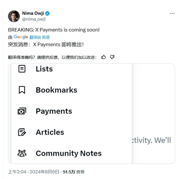 8月6日,开发者Nima Owji发布推文,曝料马斯克旗下的𝕏平台将推出𝕏 Payments支付服务,涉及交易、余额和转账等。
