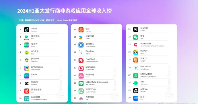 2024年上半年腾讯视频内购收入达4.7亿美元(当前约33.63亿元人民币),位列亚太非游戏应用收入榜第2名;爱奇艺跻身收入榜第3名。此外还有8款移动电商应用入围亚太非游戏应用下载榜Top30。